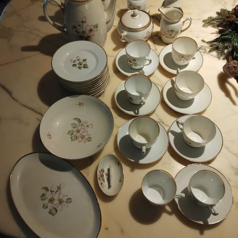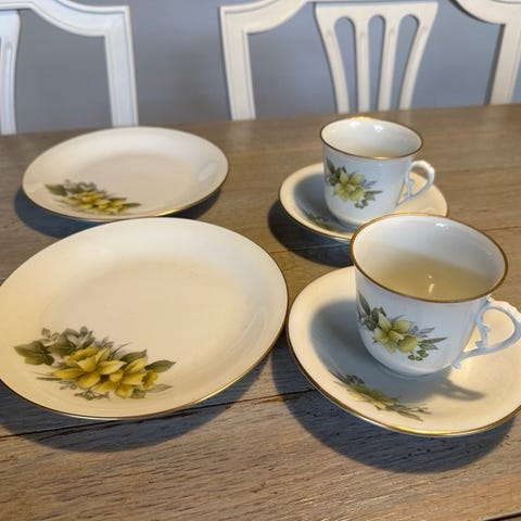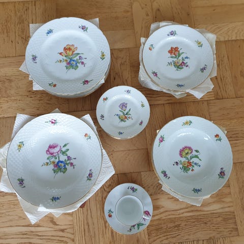10 hele sæt, samt 3 ekstra dessertallerkener og 1 ekstra kop. Kop H:7 cm, Ø:7cm, ( nr 3727/305). Underkop Ø:13cm. Desserttallerken (nr616) Ø17,5 cm. Alt i fineste kvalitet, nogle af delene har aldrig været pakket ud. Ingen skår, står med den fineste guldkant.