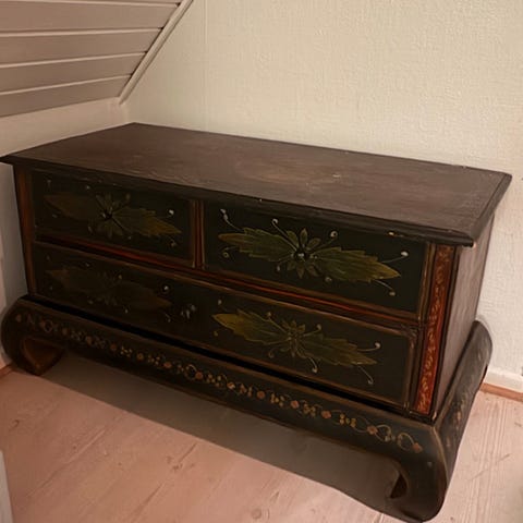 Feminin og skøn kommode malet i kalkmaling i farven “moss green” og vokset.