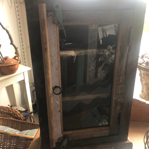 Trænger til en ordentlig afrens, da skabet står i rygerhjem. Samtidig trænger lågen til en klat lim. Skabet kan blive rigtig flot, evt med maling.