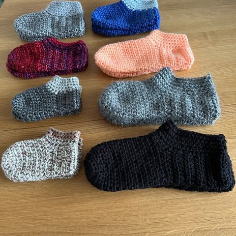 8 NYE HÆKLEDE HJEMMEFUTTER, STR 18 MDR TIL STR 41, ULD/ACRYL, KRAFTIG KVALITET. PRISEN ER IKKE TIL FORHANDLING- BUD BESVARES IKKE. SENDER GERNE. NB. ER VAREN AKTIV ER VAREN TIL SALG...SÆLGES IKKE SOM FIKS FÆRDIG, BETALING INDEN AFSENDELSE.