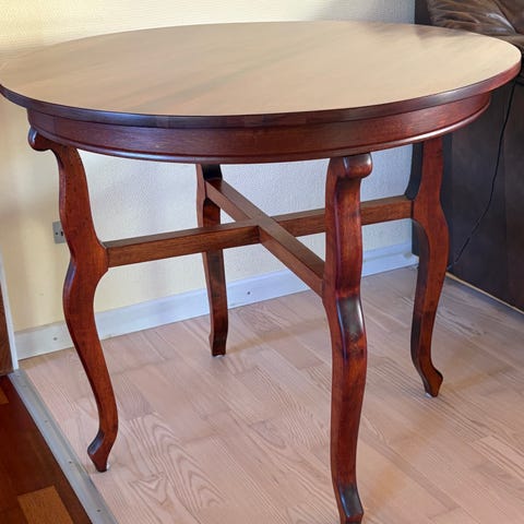 Rundt sofabord med underbord og svungne ben fra 30’erne. 94 cm i diameter
