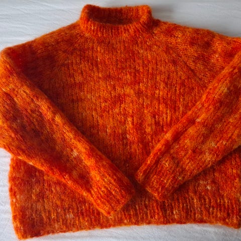 Den hvide del er strikket i Drops melody (71 % alpaca, 25 % uld, 4 % polyamid) og den rødbrune del er strikket i Silk Mohair (60 % mohair, 15 % uld, 25 % silke). Rigtig blød!