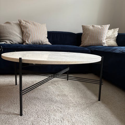 Bordplade i hvid travertin. (Produceret af GUBI)