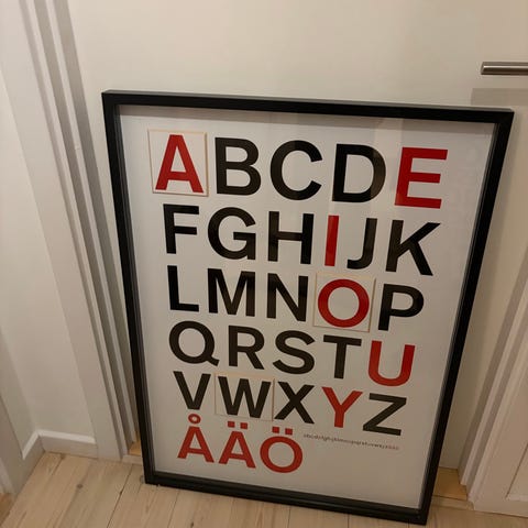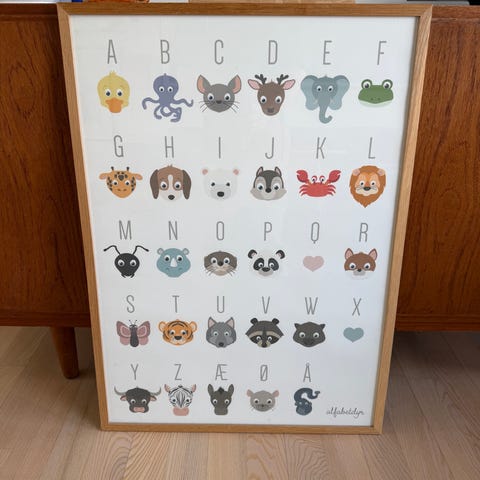 Alfabetdyr abc plakat 50x70, dansk, i hvid ribba ramme fra IKEA, men foliet har givet sig. Afhentes