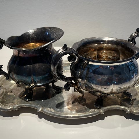 Sukkerskål i pletsølv, brugt med en del år på bagen, med brugsspor.