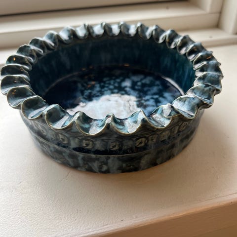 Skål med låg/terrin, i blå glasur, er i fin stand, og klar til brug, eller bare som pynt