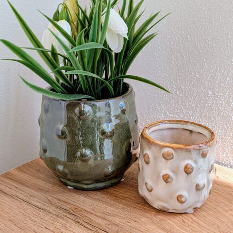 Måler 10 cm i diameter øverst og 9 cm høj.