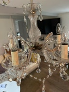 Lysekrone af glas med 5 sølv arme . Lysekronen ser flot ud med lidt højde på loftet . Den egner sig et mindre rum på grund af sin størrelse! Pærerne er til lysdæmper !