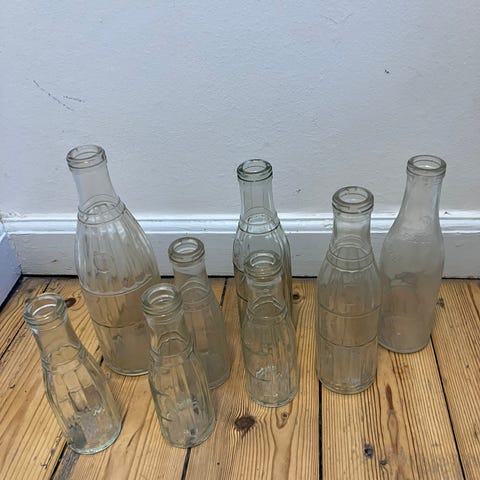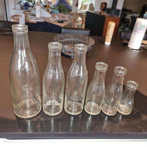 Flasker, 4. stk. af de gamle klare mælkeflasker. 1.L, 1/2 L, 1/5 del og 1. 10. del.