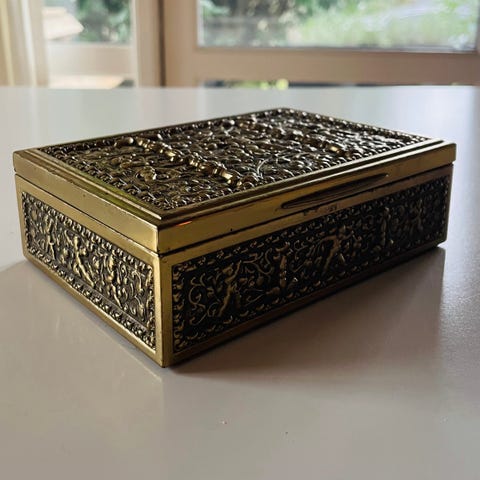 Der er her tale om flot dekoreret norsk vintage skrin / æske med indsats i teak.