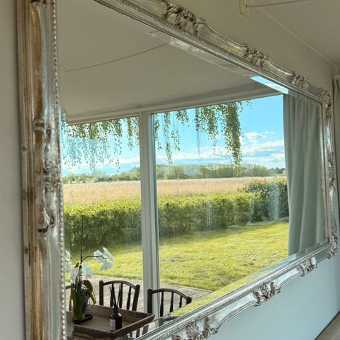 Stort spejl fra Frankrig. Muligvis valdnøddetræ fra 1850-1920. God stand. Måler ca. 101 x 74 (83) cm, H x B (B på toppen)