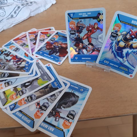Marvel Marvel Avengers spillekort med motiver af forskellige superhelte fra Marvel-universet. Kortene er designet med illustrationer af karakterer som Spider-Man, Captain America, Thor, og Hulk. Sættet indeholder flere kort med forskellige billeder og er egnet til spil og samling.