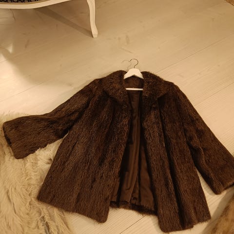 Nutria pels med ruskind i siderne, mørke brunt. Brystmål 107 cm. Længde fra skulder og ned er 110 cm. Er blevet renset på et tidspunkt og ikke brugt siden.