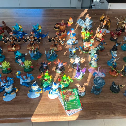 Jeg sælger mine gamle skylander figurer og spil. Der er kun et spil (imaginator), jeg har figurer fra alle spillene, dog kun et af spillene selvfølgelig også portalen. Der er 101 figurer hvor 71 af dem er unikke, (30 af figurerne er der mere end en af).