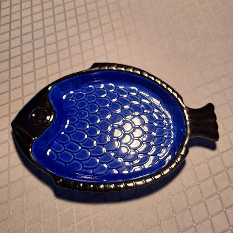 svensk keramik fad, formet som fisk i flot rødbrun glasur, perfekt stand, længde 31 cm,
