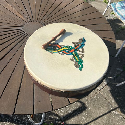 Professionel bodhran med unbrakoskruer til stemning af skindet. Meget fin stand, ramme diameter 35 cm og højde 10 cm. 2 stikker medfølger, en lang i træ og en kort med 2 hoveder, et stort og et mindre.