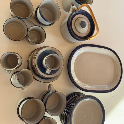 Består af 11 middagstallerkner, 11 dybe tallerkener, 12 frokosttallerkner, suppeterrin, 2 sovseskåle, 1 kartoffelskål og 6 fade i forskellige størrelser