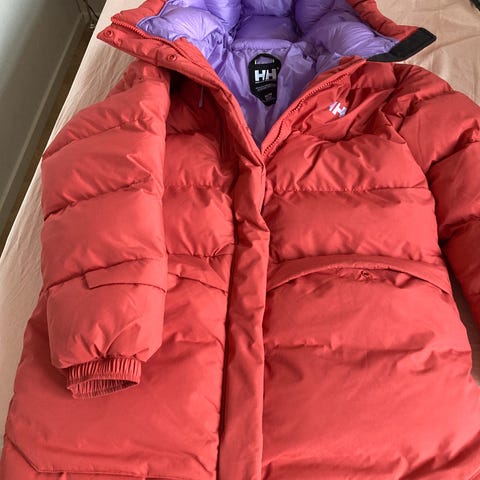 Vinterjakke str small med aftagelig hætte. Vasket med imprægneringssæbe til at være vandafvigende. Dobbelt lynlås til at kunne feks cykle med den.