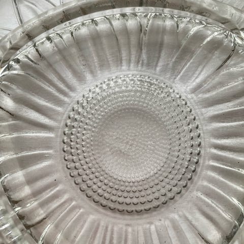 Stort Cabaret fad eller Aperitif fad, stemplet "France" i bunden, af klart glas. Anvendes også som slikskål, som tapasfad eller frugtfad. Opdelt i 5 rum.