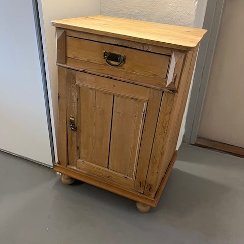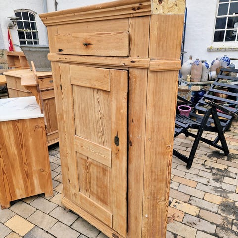 Fint gammelt afsyret skab, som har noget “patina”. Døren lukkes ikke helt i, og der er ingen nøgle.