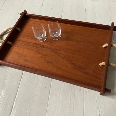 Super lækker serveringsbakke i teaktræ fra 1960 erne med maritimt præg i form af hanke i reb. Mål 50 x 35 i perfekt stand.