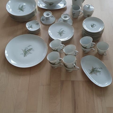 3 fade, 2 lysestager, 9 kopper, 11 underkopper, 8 side tallerken, fløde og sukker skål, med underdel.3 askebæger