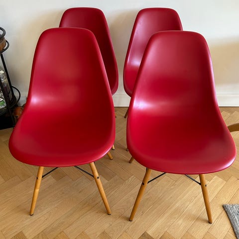 Kvittering haves på fire af stolene. De sidste to er købt af en virksomhed. Alle stole har markater under skallen.