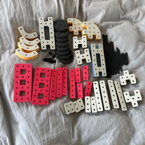 Der mangler en af hver af de brikker der er på billede 4 og en af de lange pinde, så jeg sælger det til en god pris.