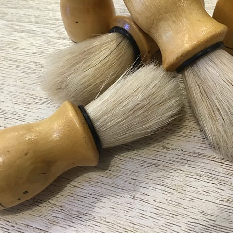 Ragekniv samt grævlinge hårs børste og æske med barberings sæbe i plastik.