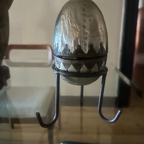 Gammel ægte strudseæg belagt med kobber motiver. Flot håndværk. Købt i Afrika. Desværre mangler der et motiv på ægget. Højde: 15cm, bredde : 12cm