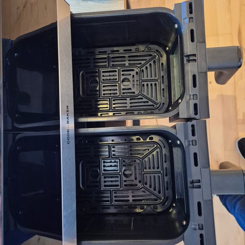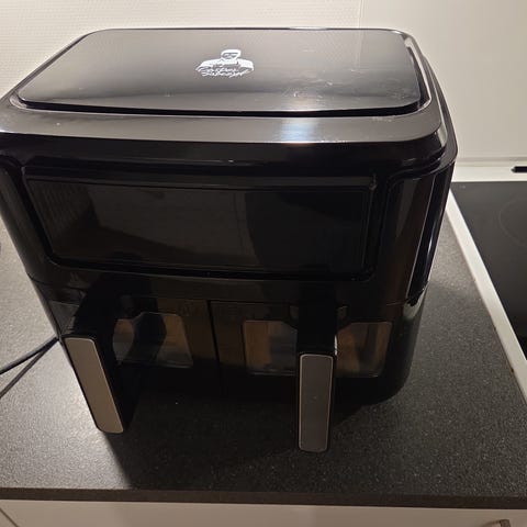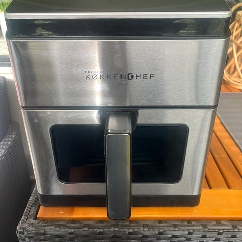 Den fejler intet og de har næsten ikke brugt den. Der høre 2 riste og en kurn med håndtag som vidst på billede.