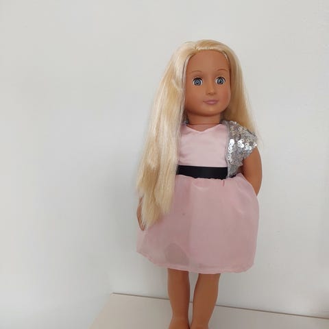 Der er to ekstra billeder, som viser drejeknapper til håret og æsken med dukkens navn.