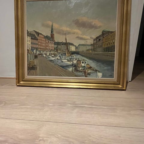 Maleri i flot guldramme med motiv af København fra Frederikholms kanal hvor man kan se kanalen og bl.a. nicolai kirke.