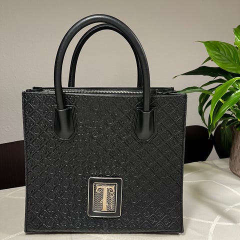 Indeni er der et stort rum og et lille smalt lynlåsrum. Den har foer af silke-aftigt beige stof. Den lukkes med to trykknapper, og hanken kan knappes af (sidder fast med trykknapper inde i tasken).
