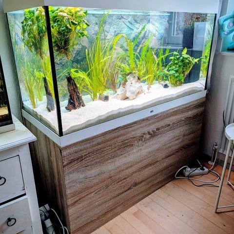 Lækkert stort akvarie. Sælges med tilbehør ( fisk, rødder osv. ) desuden en spand pumpe se foto. Underskab kan medfølge mod merpris.