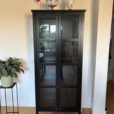 Elegante vitrineskab i mørkt træ med 1 bakke.