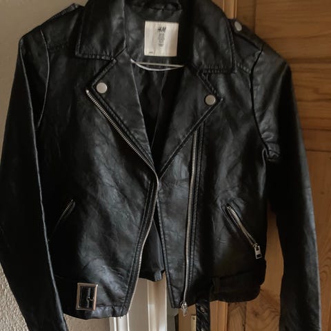 Lyserød "læderlook" jakke fra H&M i str. 140 med skrå lynlås og to lommer foran.