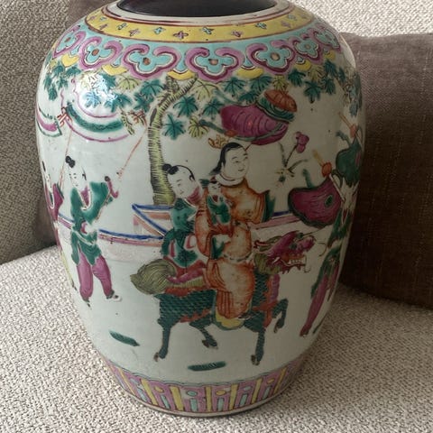 Meget smuk kinesisk låg krukke fra ca 70`erne, h ca 16 cm incl låg i flotte farver sælges 320,-kr