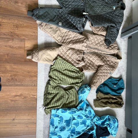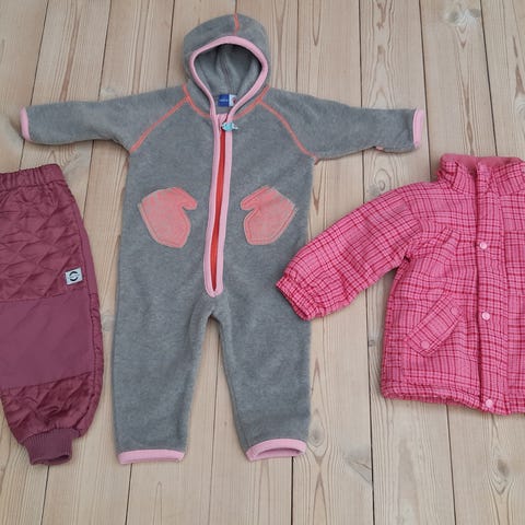 Uundværlig overtøjs-pakke med både fleece tøj, regntøj, heldragter (2 stk.) jakker.