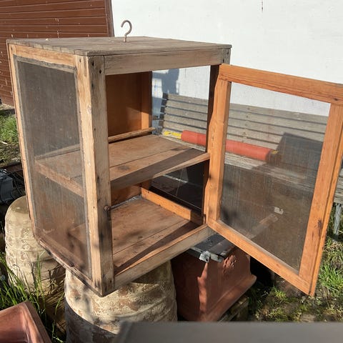 Skabet står i charmerende, original og antik stand med ormehuller, lidt afskallet maling hist og her samt lidt rust på noget af fluenettet.