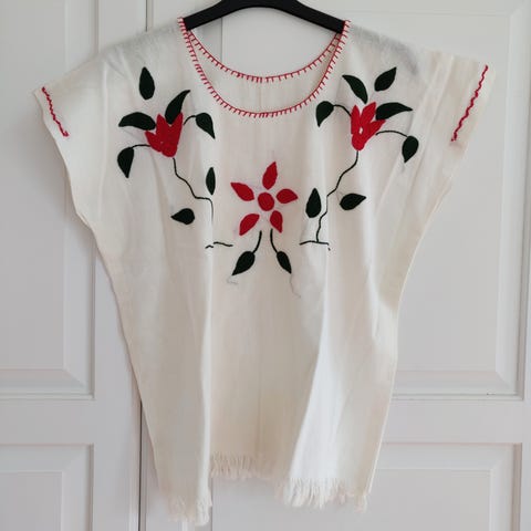 Smuk hvid bluse med broderier og blonde syet af to duge, str M-L i eget design, Design by Jane, sælges 850,-kr