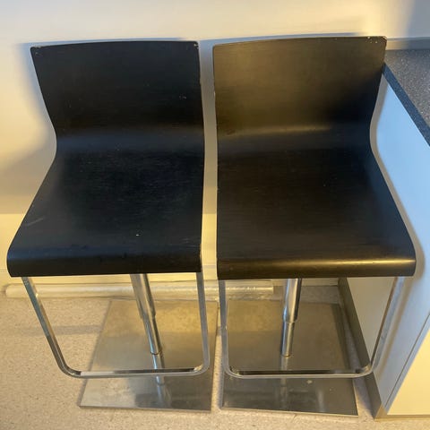 Flotte barstole. Den ene med originalt sæde. Den anden hjemmelavet. Let at lave eget sæde :)