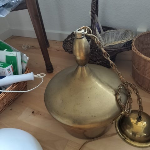 Anden arkitekt, messing Skibslampe / pendel. Utrolig flot og særdeles speciel lampe med vægtstang og vægtlod sælges. Ophænget/kæden er 100cm lang. Vægtstangen er 56cm lang. Skærmen har diameter på 30cm. Lampen har aldersrelaterede brugsspor. Producent ukendt.