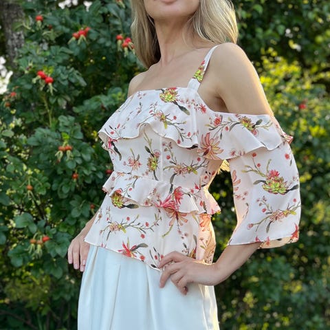 Rachel Zoe bluse i viskose. grønt og gult blomstermønster. Str S.