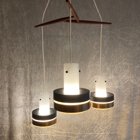 Pendel med to skærme af glas monteret på skinne af messing og teak. I fantastisk god stand.