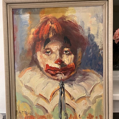 Velholdt stort spændende maleri "Klovn" af billedkunstner Mona Jørgensen, Galleri M, Skive. Pris 5.000 kr. sælges snarest for ½ pris 2.500 kr. pga. for lidt plads. Størrelse 100 x 150 cm.