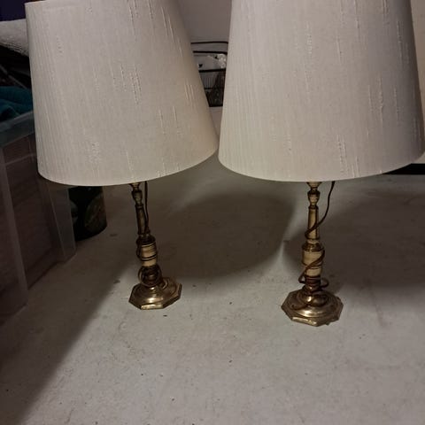 To ens bordlamper med gamle messinglampefødder og nyere Ikea-skærme. Det hele er i fin stand og er med ny el, herunder gennemgangsafbryder. Lamperne måler 73 cm i højden og 32 i diameter. Sælges kun samlet, og prisen er for dem begge.