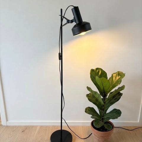 Spottene er 22 cm høje og kan vippes og drejes og indstilles i højden på den 139 cm høje stander i krom.