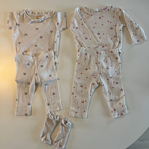 Tøjpakke med 21 stk. tøj, bl.a. 2 par bukser, 2 bluser, 6 kjoler, 6 heldragter (Danefæ strik skal sys lidt i skridtet), 2 t-shirts/toppe, strømpebukser m.m. H&M, PompDeLux, Danefæ m.m. Nyere og brugt, pletter og huller kan forekomme. Fra røg- og dyrefrit hjem, vasket i svanemærket.