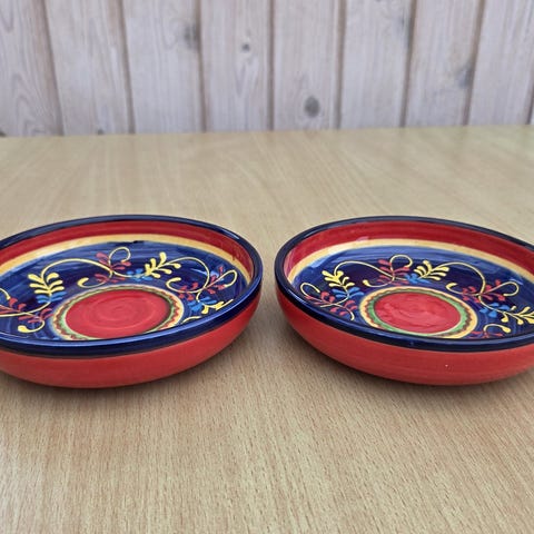 Den smukke klassiske keramikskål med håndtag : Højde 7 cm. Diameter top 18,5 cm og Længde med håndtag 27 cm.